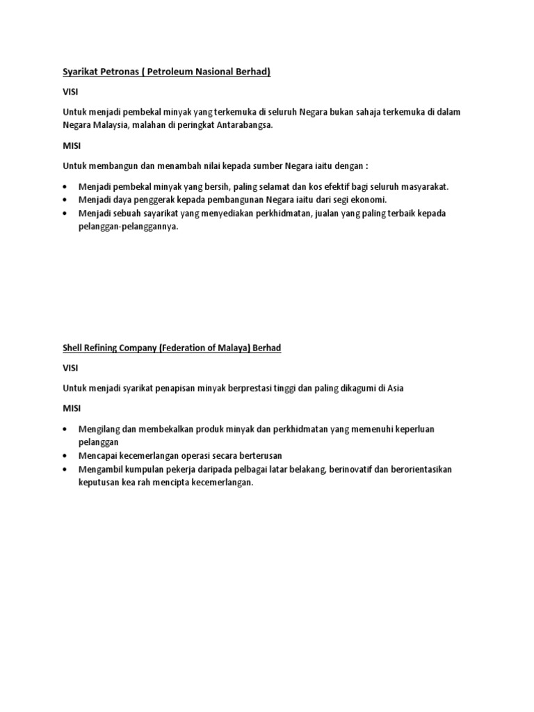 PENETAPAN VISI MISI DAN OBJEKTIF PERNIAGAAN pada 2021-07-21. Search visi dan misi petronas malaysia and check where the nearest petrol station is. Petronas ditubuhkan pada 17 Ogos 1974 dan dimiliki sepenuhnya oleh kerajaan Malaysia.